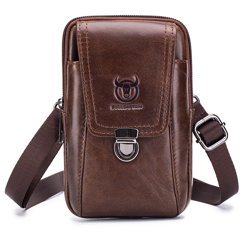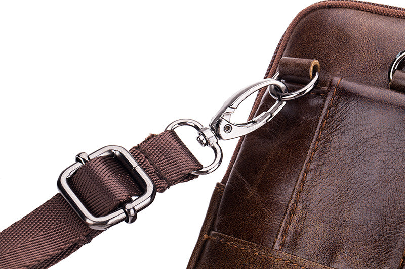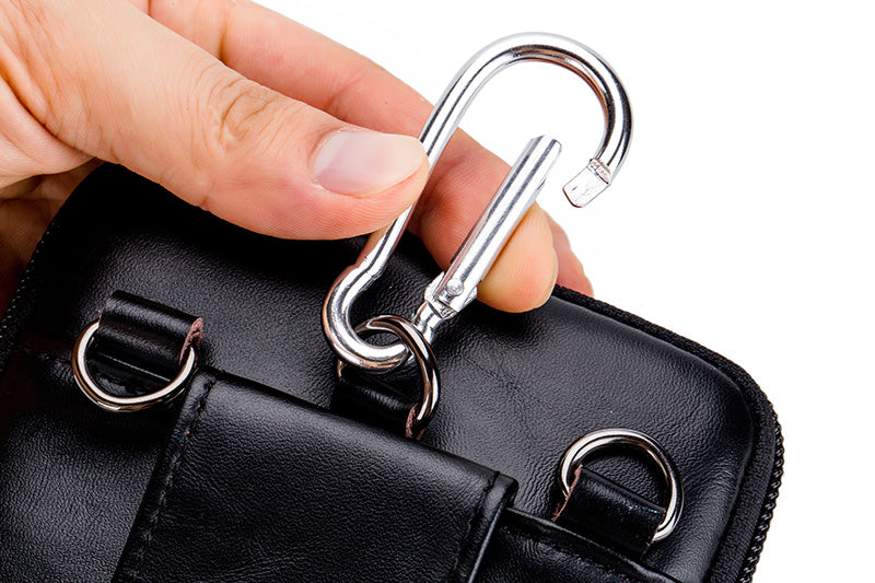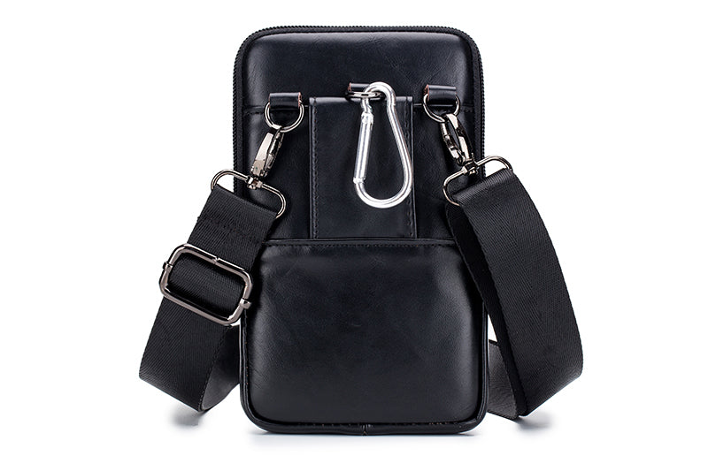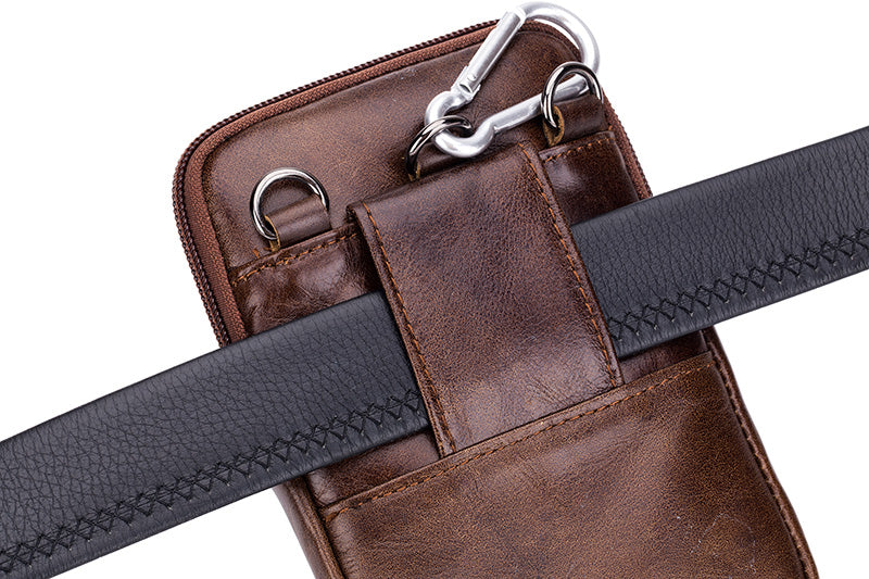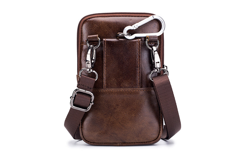 The leather cell phone purse features a convenient belt clip, 1 removable and adjustable strap, and 1 clip that can be hooked onto backpacks, pants loops, or suitcases as an accessory bag.