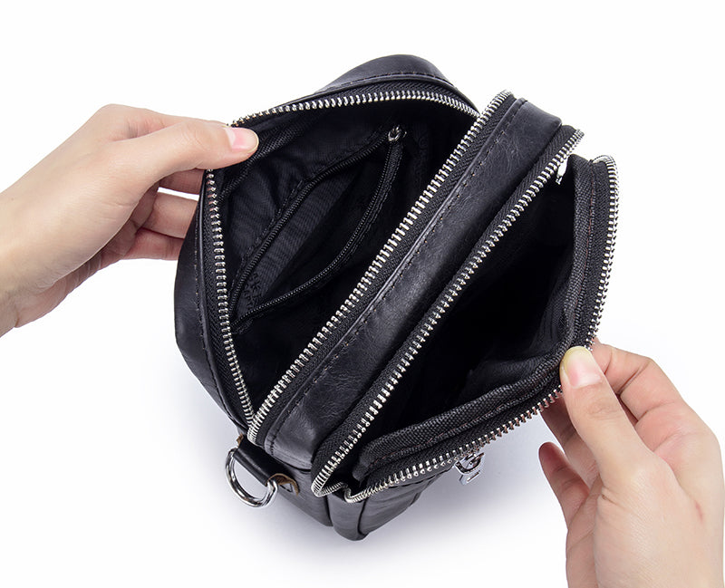 - There are multiple pockets, including two main zipped pockets, an interior zipper pocket, and two exterior zipper pockets. This compact bag provides ample space to organize your essentials such as phone, wallet, keys, and more.