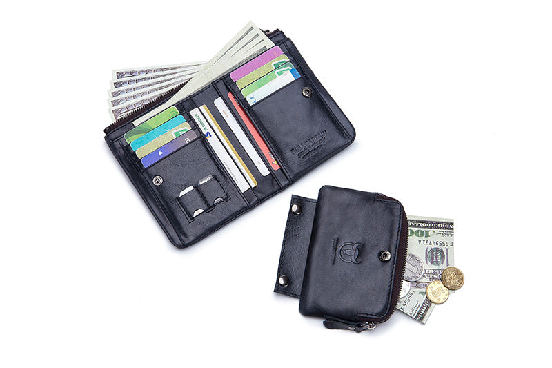- This wallet uses advanced RFID blocking technology to prevent electronic thieves, prevent your data from unauthorized scanning,It is an important guardian of information security. anti-theft chain also keep the wallet safe or prevent loosing when shopping, cycling or hiking.